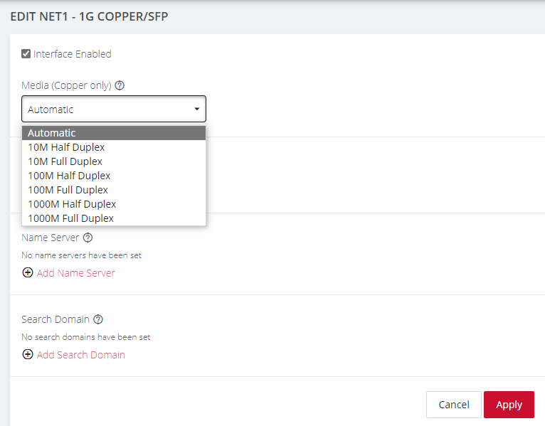 To change the interface media setting, click the Edit button and edit the media settings as needed and click Apply.