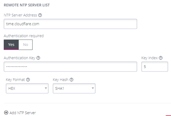 When defining an NTP server you can choose to supply an Authentication Key and Authentication Key Identifier or not to use Authentication. If NTP Authentication keys are in use, the NTP server must be verified using the Authentication Key and Authentication Key Index before synchronizing time with the server.
