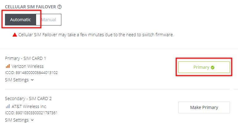 - Under Cellular SIM Failover click the Automatic button, this will display the Primary selection buttons.